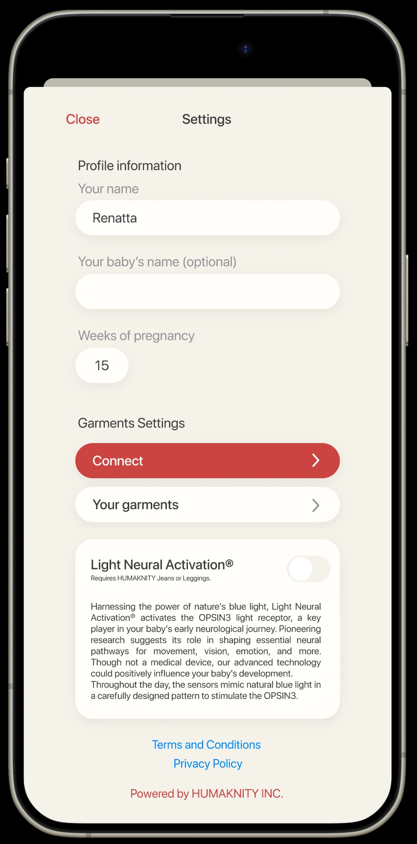 En el menú principal de la app HUMAKNITY, selecciona la opción de "Configuración" en . Aquí es donde se encuentran las funciones avanzadas de t prenda, incluida la de Light Neural Activation.